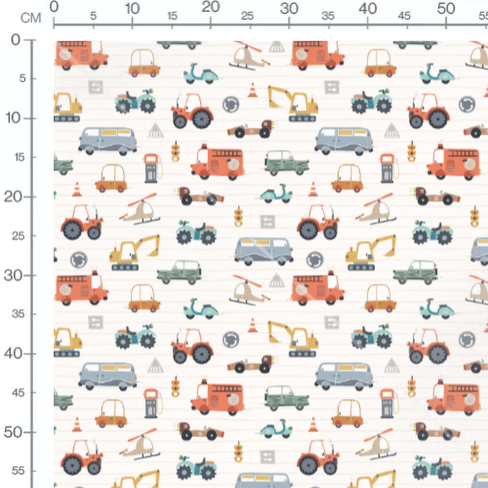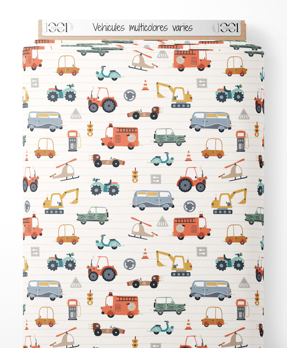 Tracteurs et scooters en bleu et vert. Panneaux de signalisation et feux tricolores en gris et orange. Pompes à essence et cônes de signalisation en rouge et orange.Les tissus