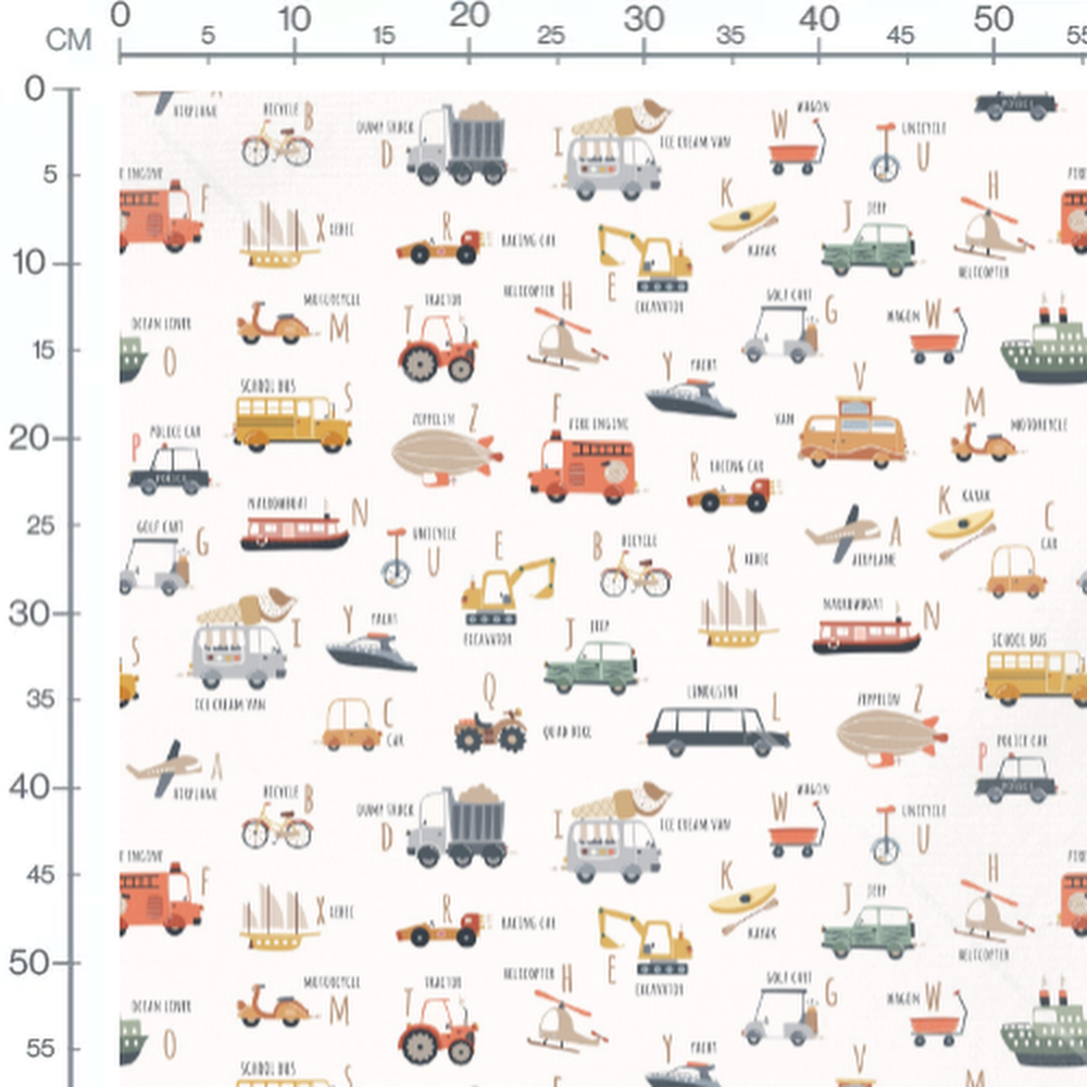Bateaux, hélicoptères et bus scolaires en nuances douces. Motocyclettes et dirigeables accompagnés de lettres de l'alphabet. Engins de chantier et voitures de course dans des couleurs harmonieuses.Les tissus