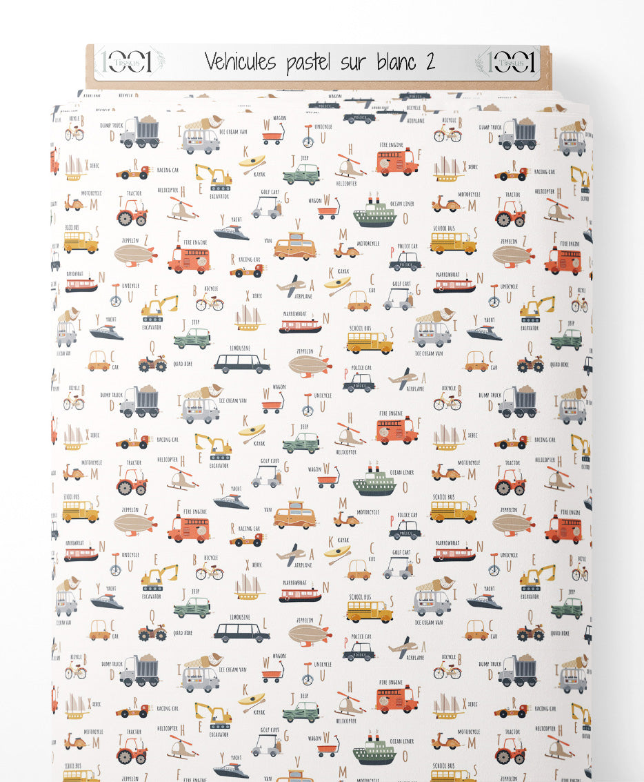 Tissu - Véhicules pastel sur blanc 2