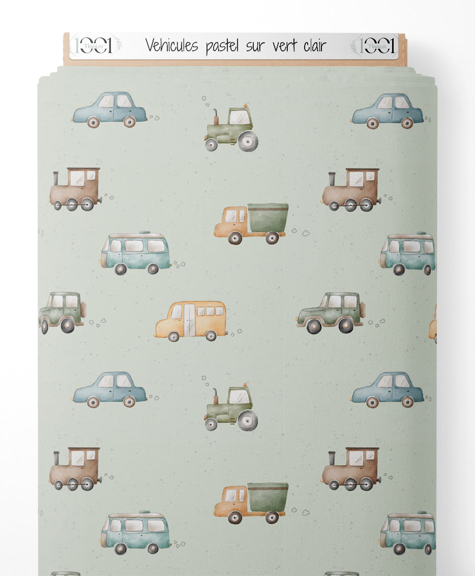 Les véhicules incluent des voitures, des camions, un bus et un tracteur. Chaque véhicule est dessiné dans des couleurs pastel comme le bleu, le vert et l'orange. Le fond vert clair ajoute une touche douce et apaisante au motif.Les tissus