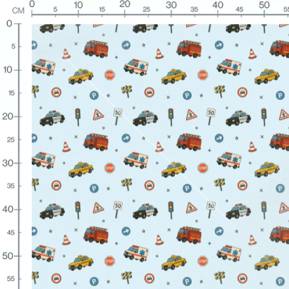 Voitures de police et feux de signalisation ajoutent des détails au motif. Panneaux de stationnement et limitations de vitesse complètent le thème urbain. Petits symboles et flèches dispersés sur le fond.Les tissus