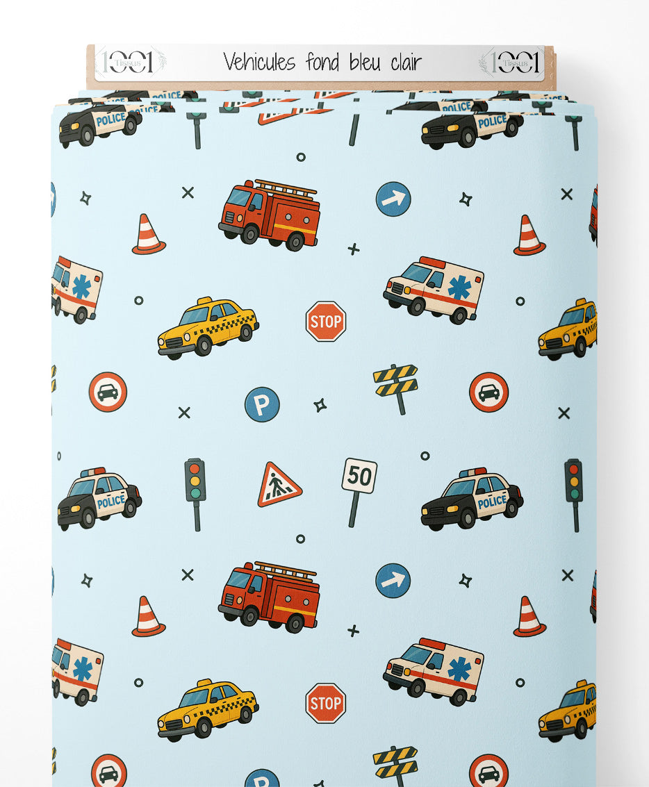 Tissu - Véhicules sur fond bleu clair