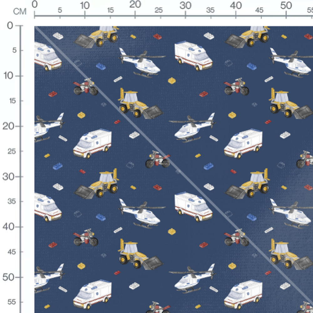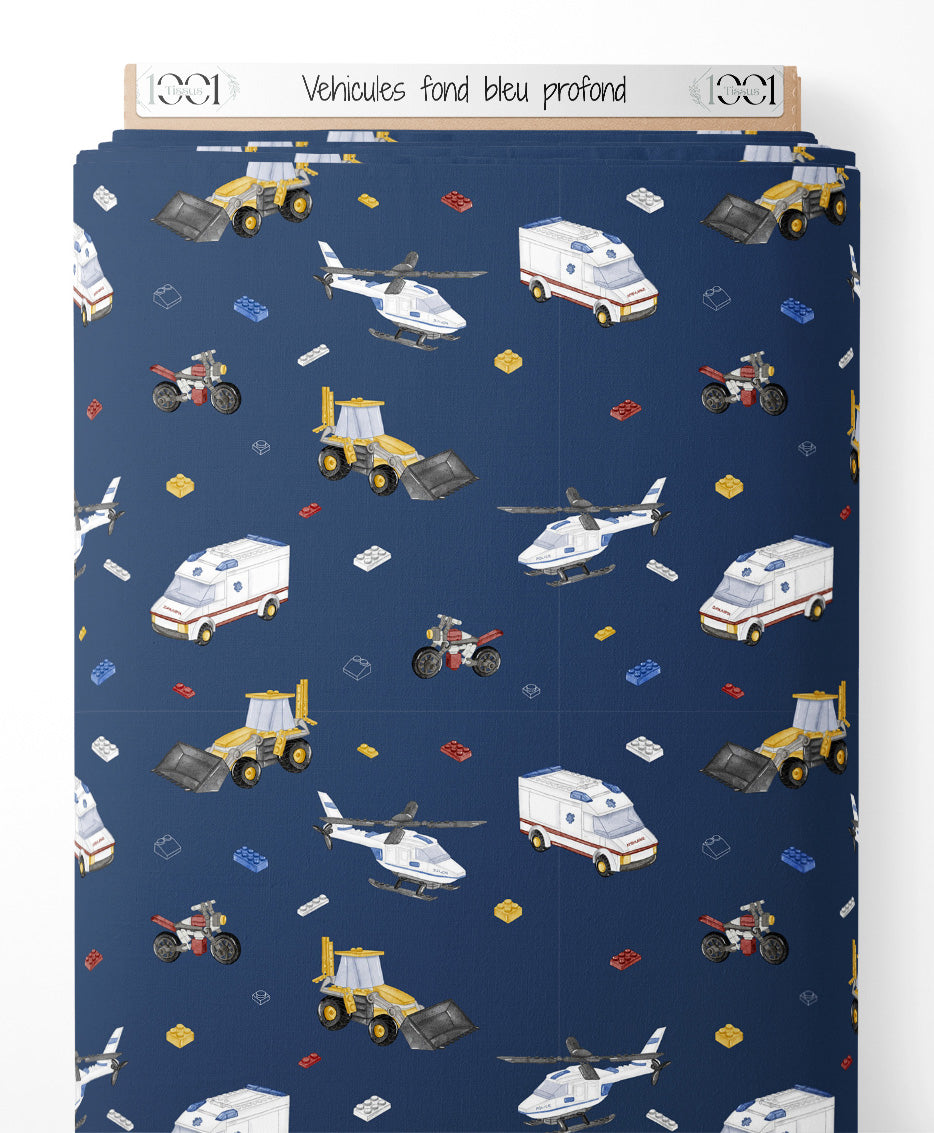 Les véhicules incluent des hélicoptères, des ambulances et des motos. Les briques de jouets sont dispersées en rouge, jaune et bleu. Le fond est d'un bleu profond.Les tissus