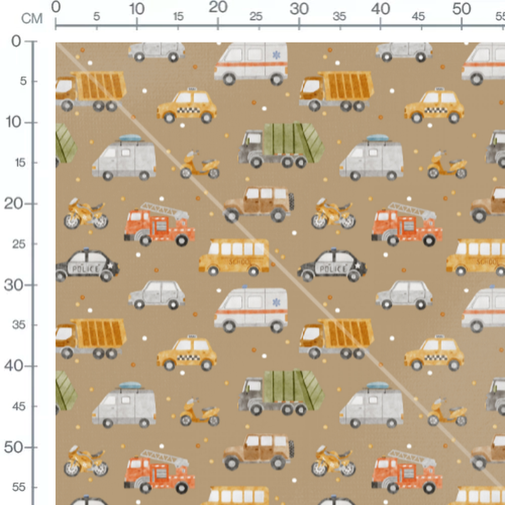 Ambulances blanches et camions de pompiers rouges se distinguent. Taxis jaunes et bus scolaires ajoutent une touche vive. Motos et voitures de police complètent le motif.Les tissus