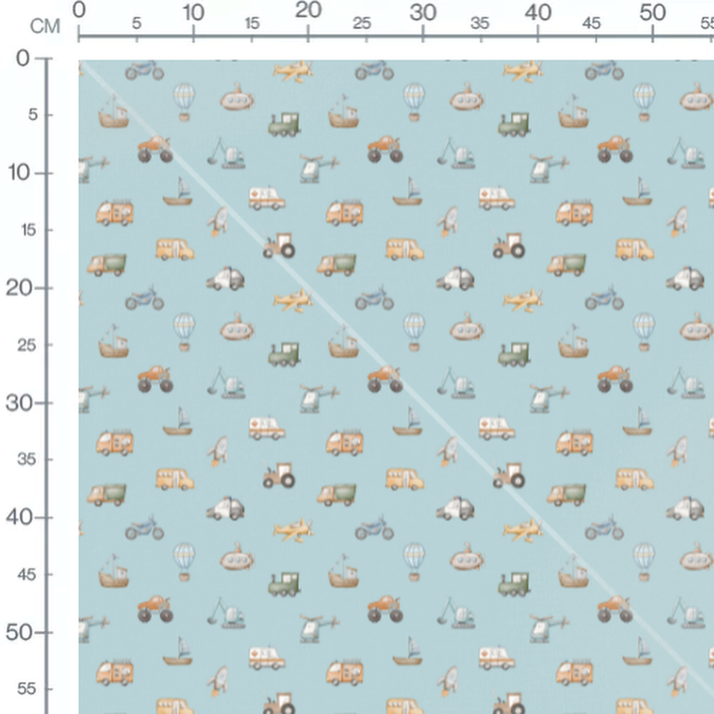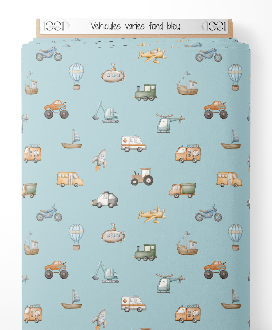 Les véhicules incluent des voitures, des camions, des avions, des bateaux et des montgolfières. Les couleurs sont pastel avec des nuances de bleu, orange et vert. Chaque véhicule est dessiné avec des détails simplifiés et enfantins.Les tissus