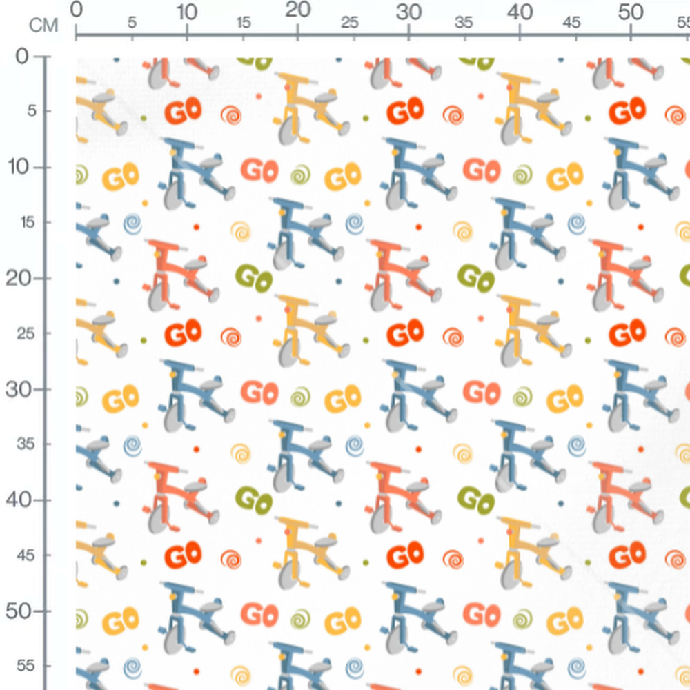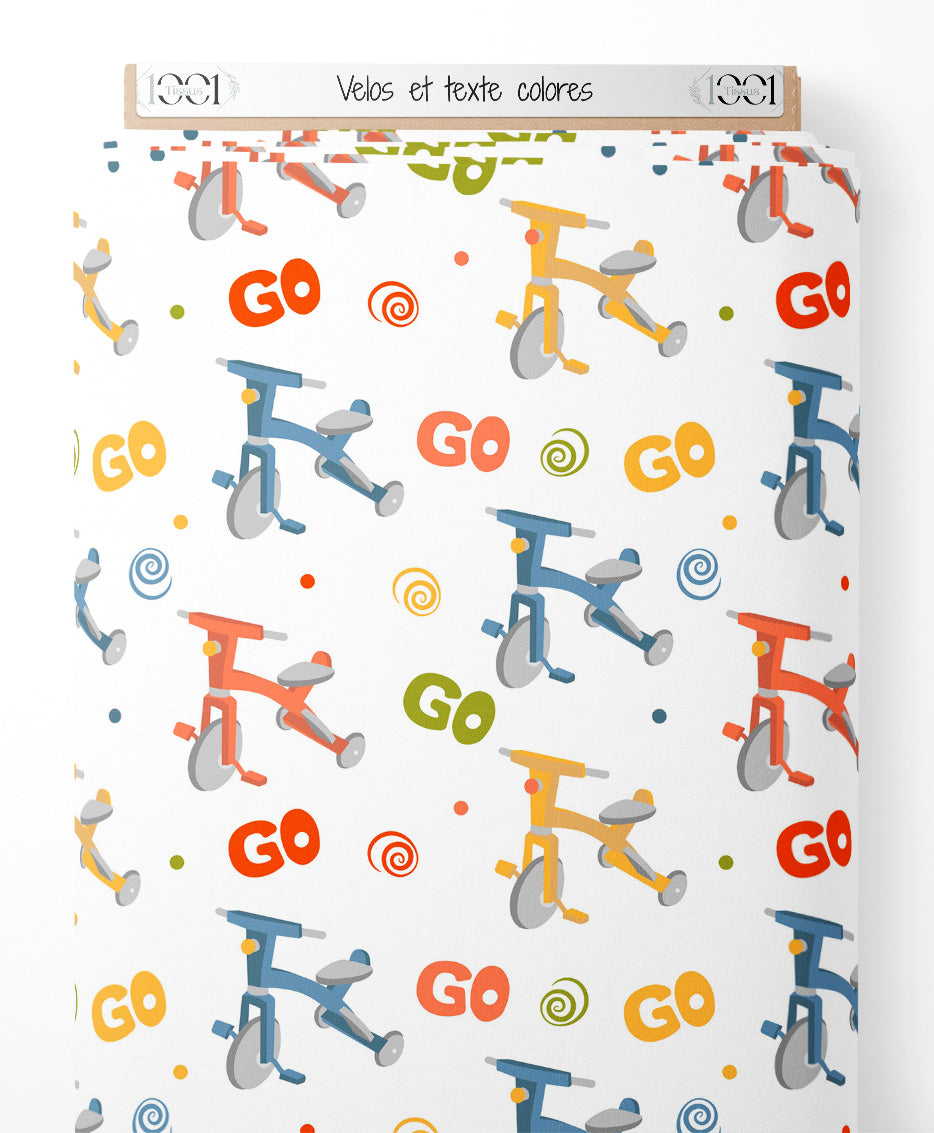 Les vélos sont accompagnés de points et de spirales en orange, vert et bleu. Le texte 'GO' est écrit en rouge, orange et vert. Les motifs sont répartis uniformément sur le fond blanc.Les tissus