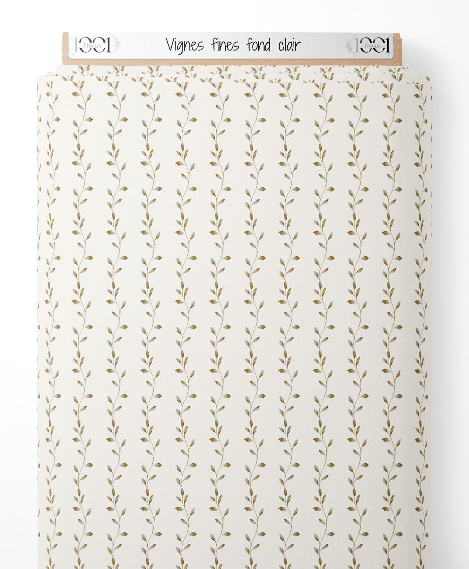 Les vignes sont disposées en lignes verticales régulières. Les feuilles sont petites et de couleur verte, ajoutant une touche naturelle au motif.Les tissus