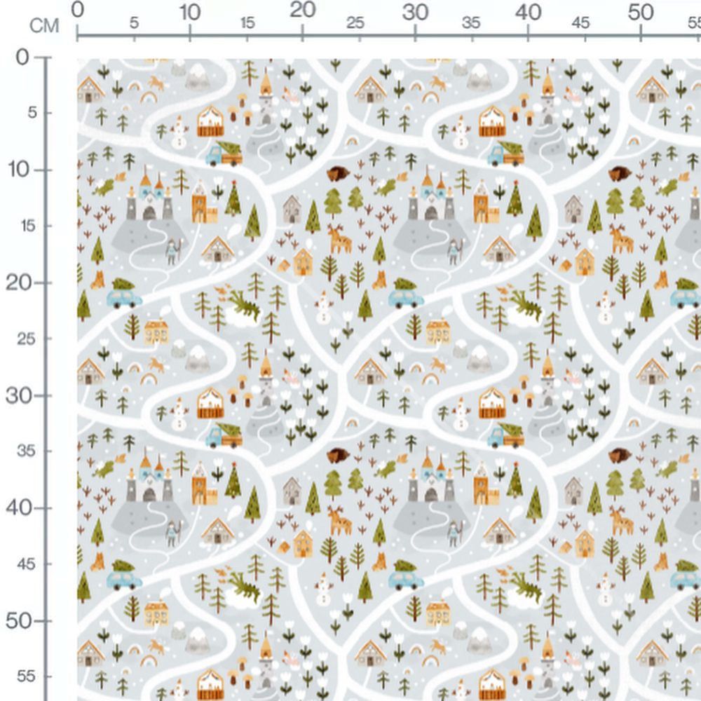 Des routes sinueuses traversent le paysage. Des montagnes enneigées et des arcs-en-ciel ajoutent une touche magique. Des véhicules colorés et des bonhommes de neige complètent la scène.Les tissus