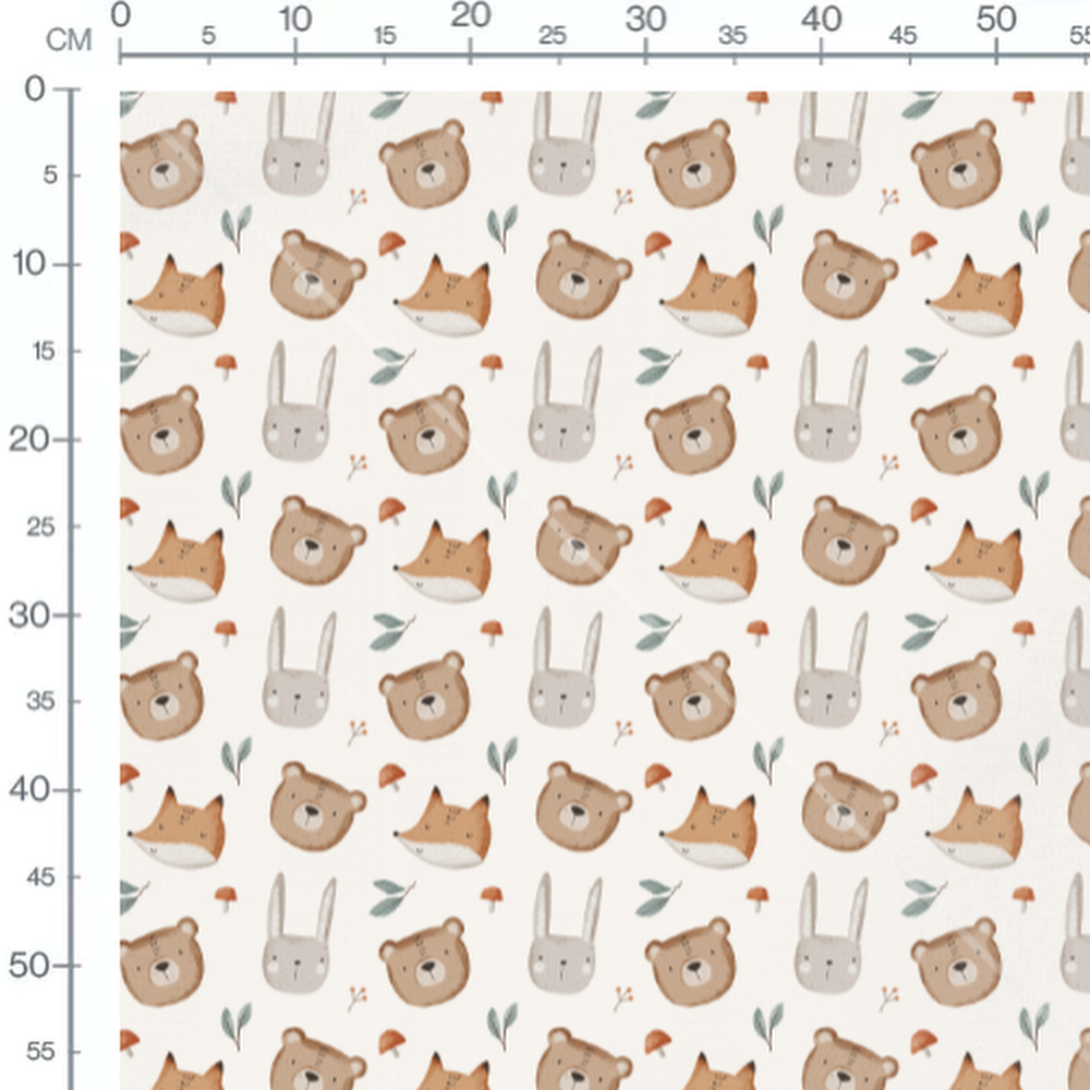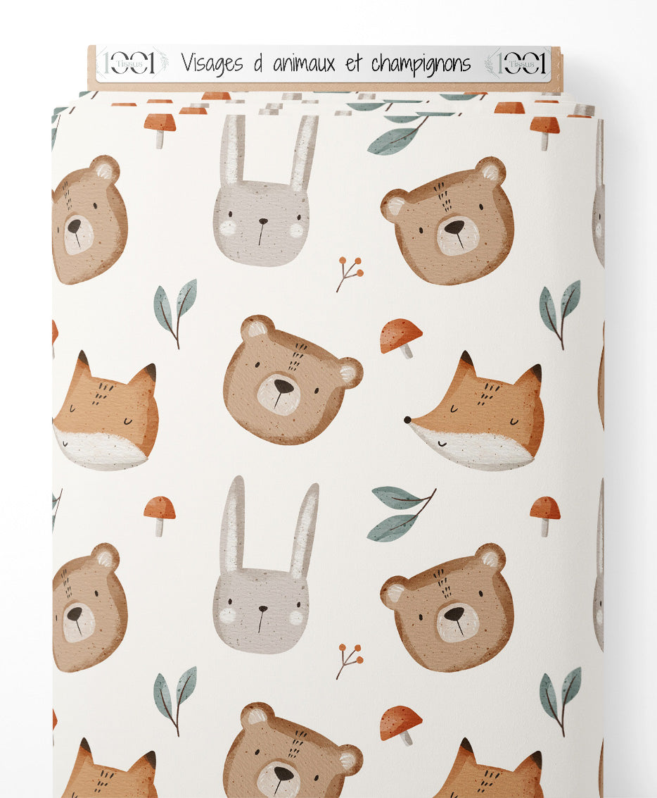 Les visages d'animaux sont dessinés dans des tons doux et naturels. Les champignons sont orange avec des tiges blanches. Des petites branches avec des baies ajoutent une touche de couleur.Les tissus