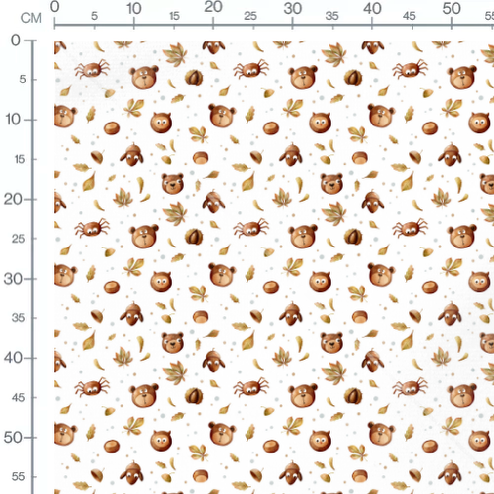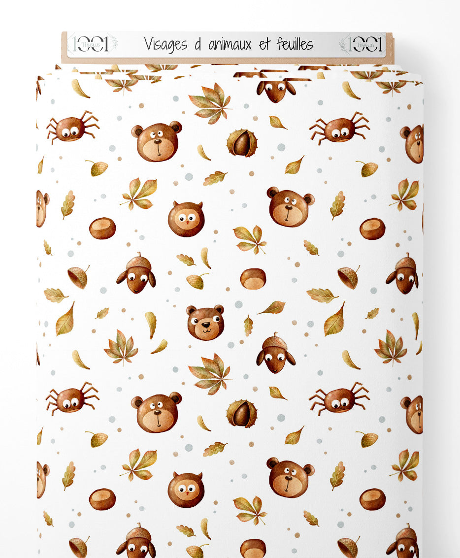 Les visages d'ours et de hiboux sont entourés de feuilles d'automne. Des glands et des châtaignes complètent le motif. Quelques araignées marron sont également présentes.Les tissus