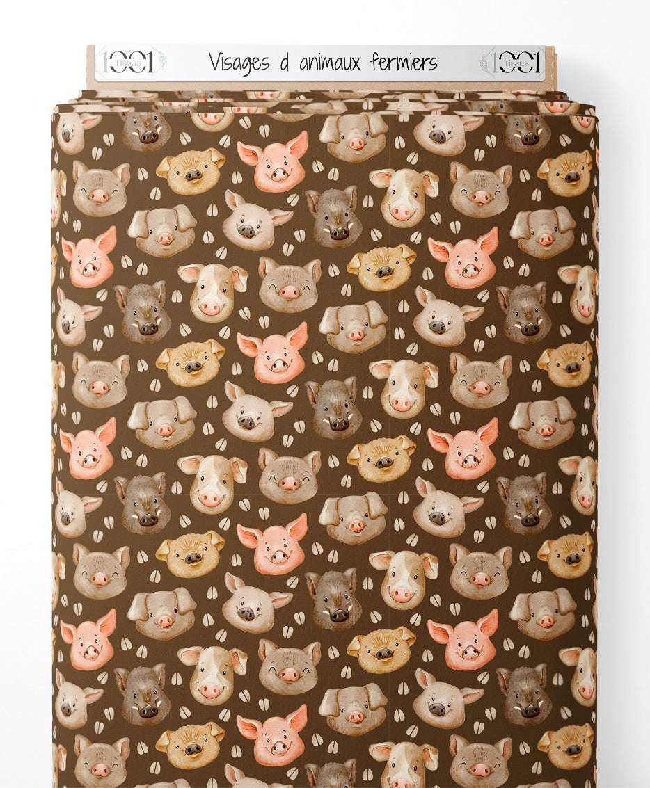 Les cochons sont roses avec des oreilles pointues. Les moutons ont une laine beige et un visage souriant. Les vaches présentent des taches blanches et brunes. Les empreintes blanches ajoutent un détail ludique au motif.Les tissus