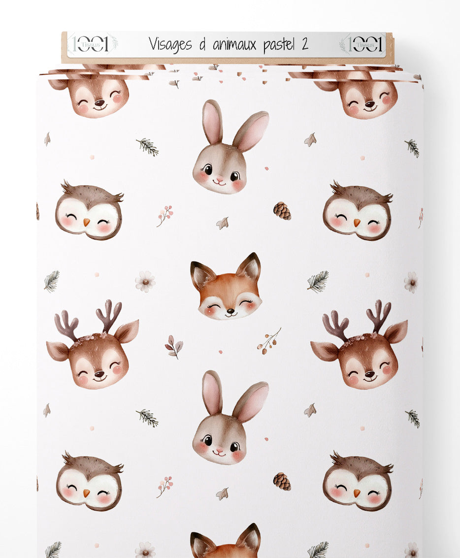 Les animaux ont des expressions souriantes et des joues roses. Des éléments comme des pommes de pin et des petites fleurs ajoutent une touche naturelle. Les couleurs sont douces et pastel, créant une ambiance chaleureuse.Les tissus