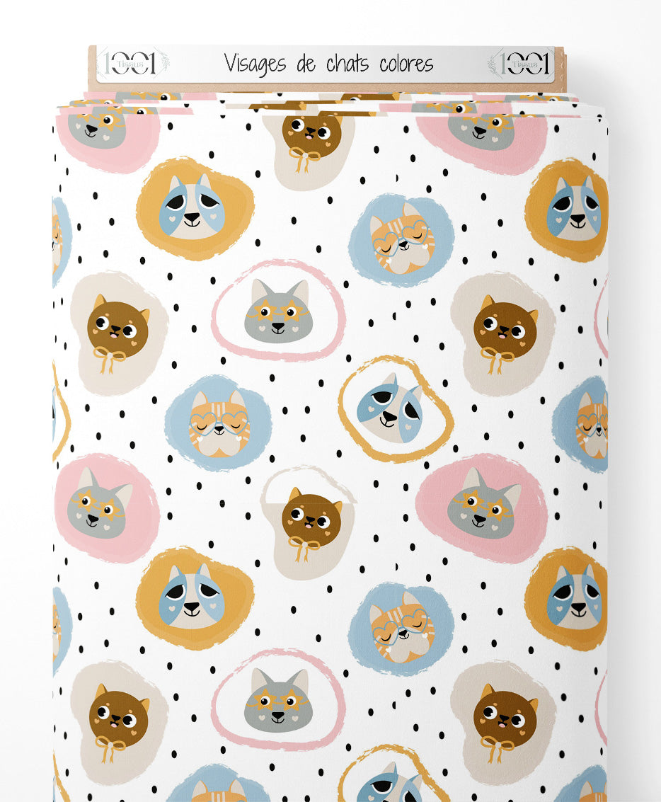 Les chats ont des expressions variées et sont entourés de cercles colorés. Les couleurs incluent le rose, le bleu, le beige et le jaune. Chaque chat a une expression unique, ajoutant de la diversité au motif.Les tissus