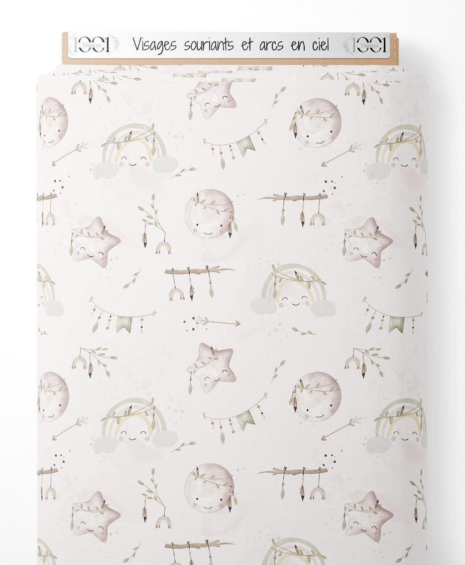 Les visages sont entourés de petites feuilles et de flèches délicates. Les arcs-en-ciel sont accompagnés de nuages doux. Des guirlandes et des branches ajoutent une touche naturelle au motif.Les tissus