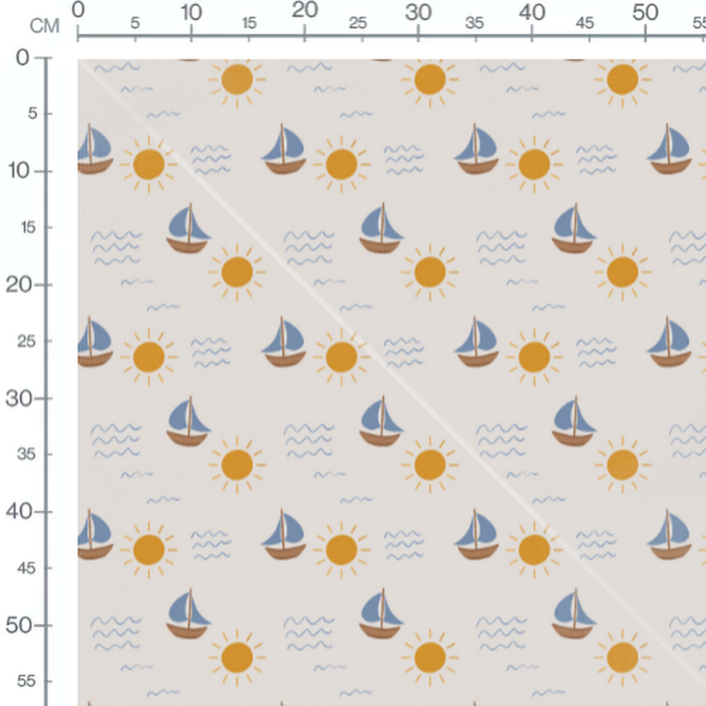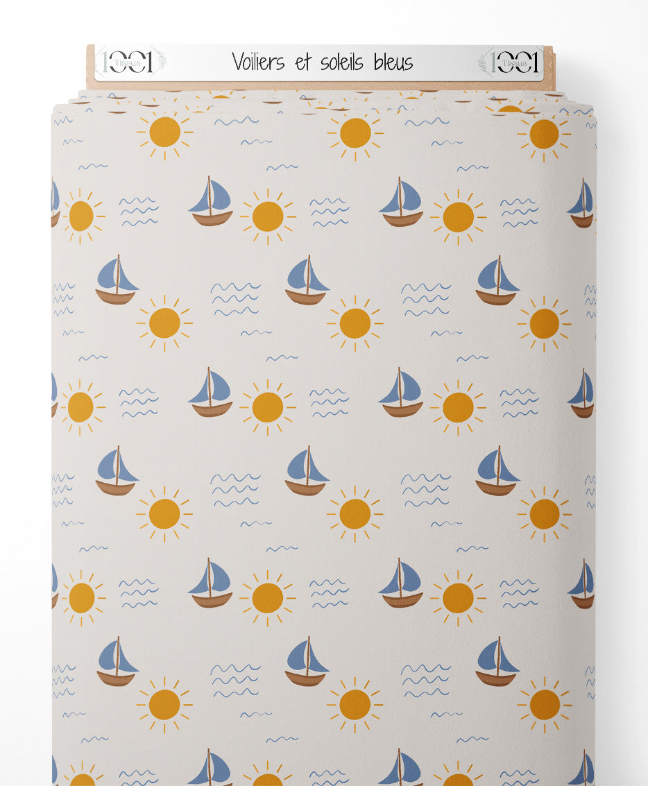 Les voiliers sont orientés dans différentes directions. Les soleils sont entourés de rayons courts. Les vagues sont dessinées en lignes courbes et répétées.Les tissus