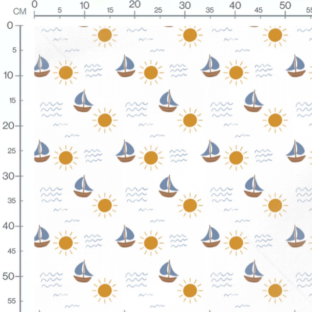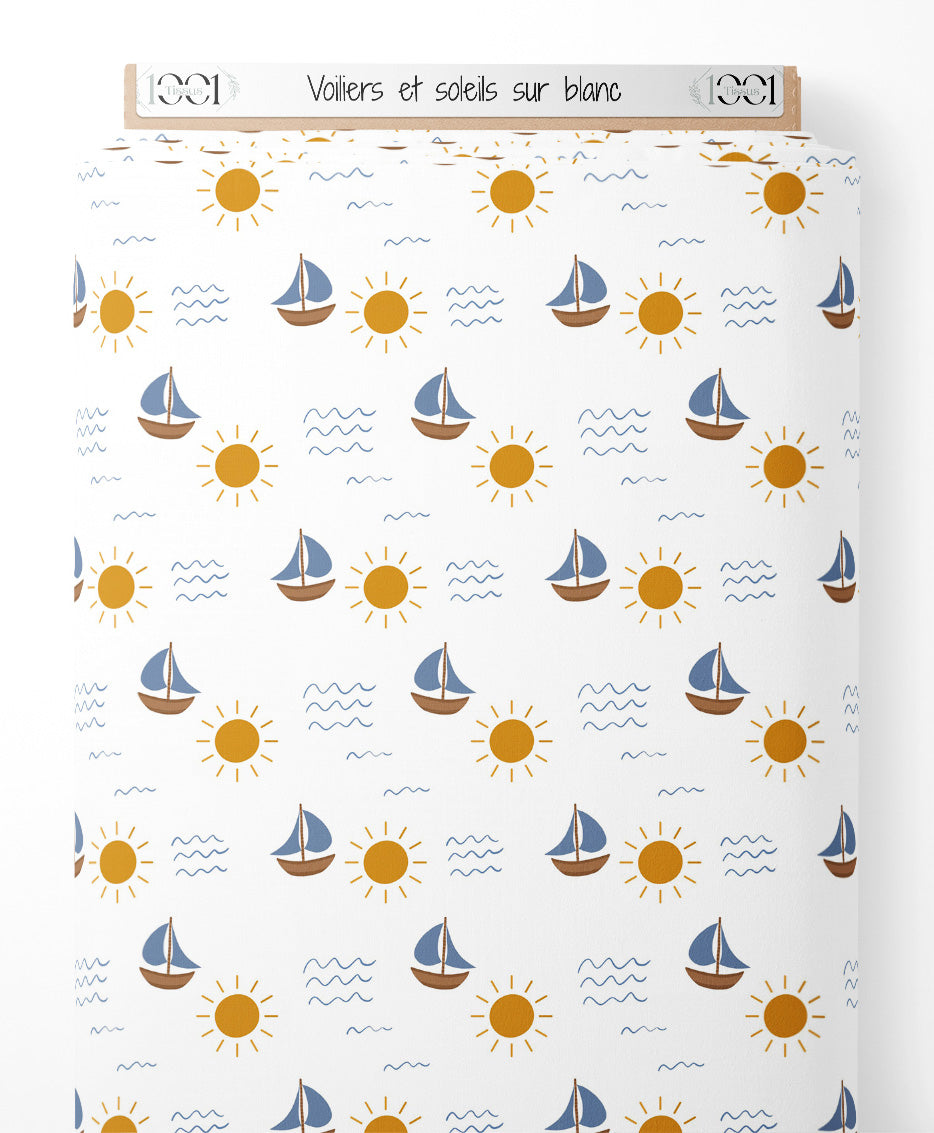 Les voiliers sont orientés dans différentes directions. Les soleils sont entourés de rayons courts. Les vagues sont formées de lignes ondulées.Les tissus