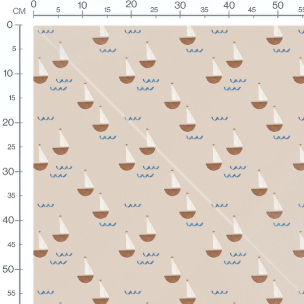 Les voiliers sont stylisés avec des coques marron et des voiles blanches. Les vagues sont représentées par des lignes courbes bleues. Le fond beige ajoute une touche douce et neutre au motif.Les tissus