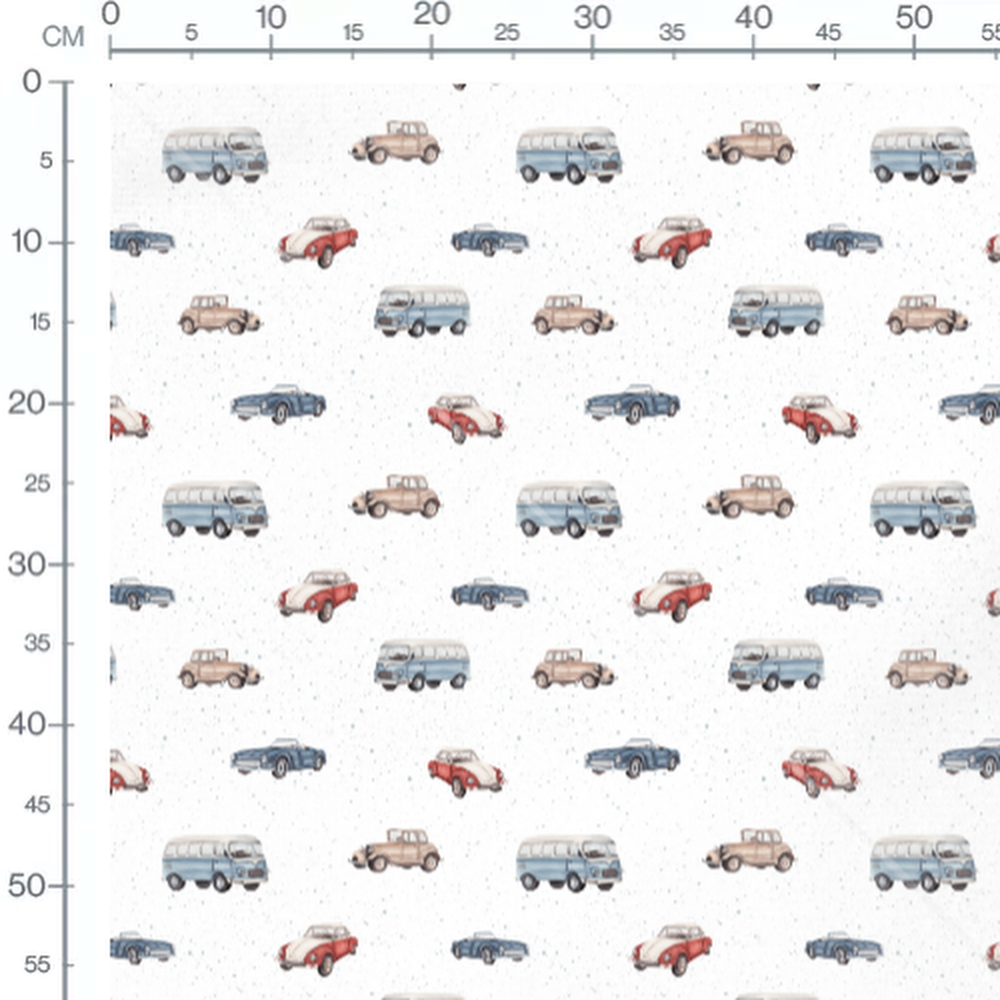 Les voitures incluent des modèles de bus et de voitures classiques. Les teintes douces de bleu, rouge et beige créent un effet aquarelle. Le fond blanc est légèrement texturé avec des taches grises discrètes.Les tissus
