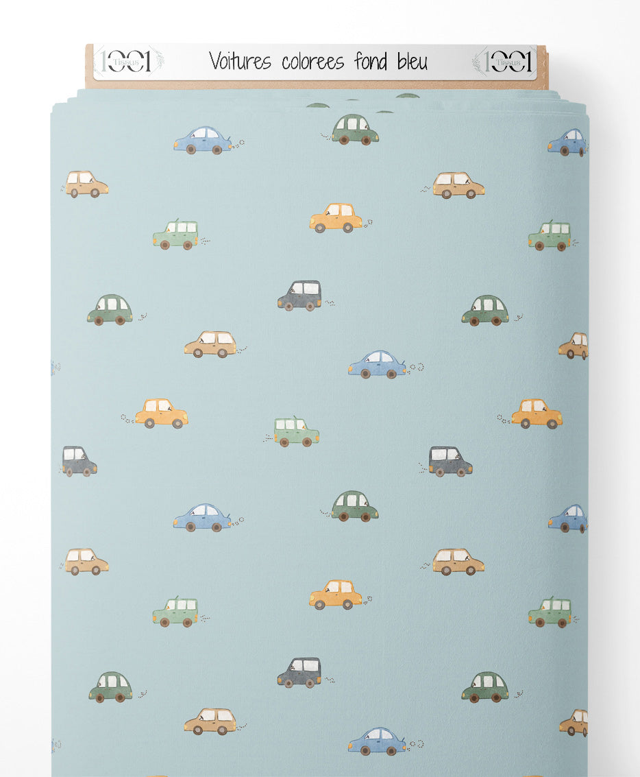 Les voitures sont dessinées de manière enfantine avec des détails simples. Chaque voiture a une couleur distincte, ajoutant une variété visuelle. Le fond bleu clair met en valeur les couleurs des voitures.Les tissus