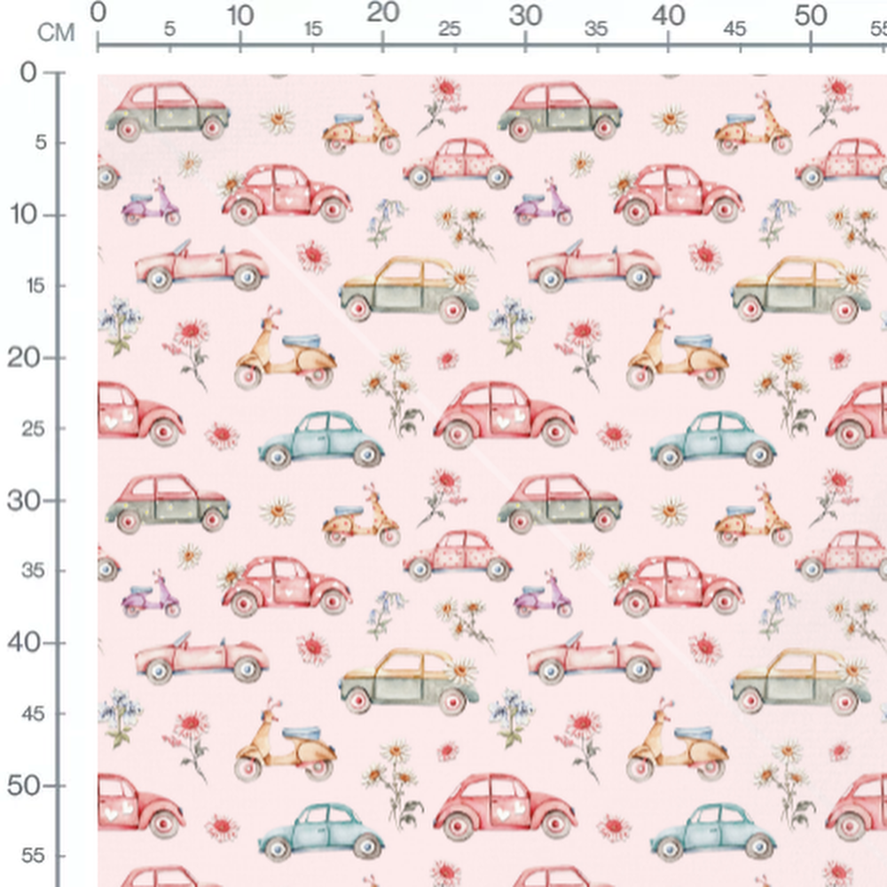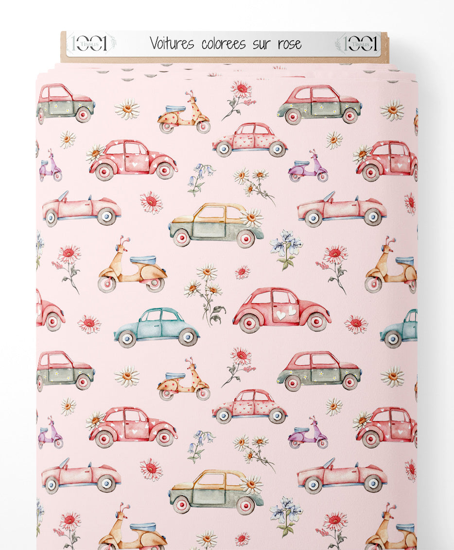 Tissu - Voitures colorées sur rose