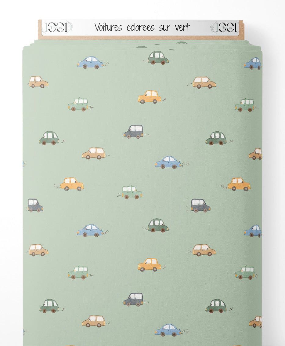 Tissu - Voitures colorées sur vert