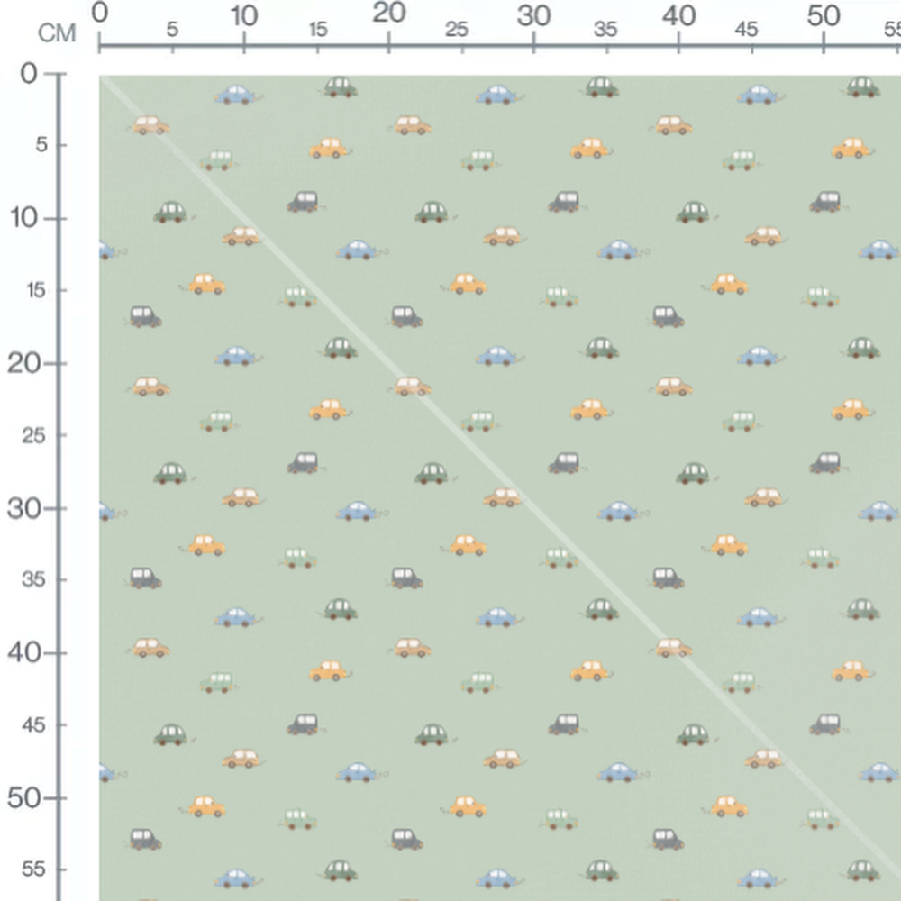 Les voitures sont dessinées de manière enfantine avec des détails simples. Chaque voiture est entourée de petites lignes suggérant le mouvement. Les couleurs douces créent une ambiance ludique et apaisante.Les tissus
