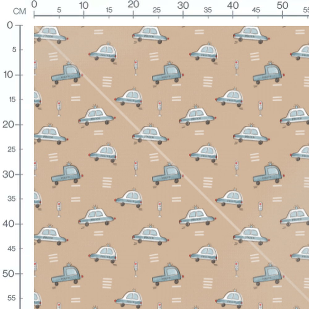 Les voitures de police sont illustrées avec des détails simples et des couleurs douces. Les feux de circulation ajoutent une touche urbaine au design. Les lignes blanches apportent un élément graphique au fond beige.Les tissus
