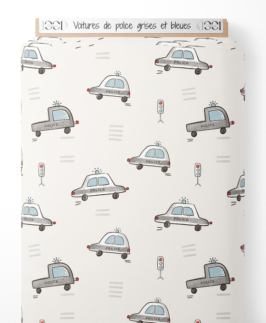 Les voitures de police sont illustrées avec des détails simples et des couleurs douces. Les feux de signalisation ajoutent un élément urbain au motif. Les traits gris apportent une touche graphique discrète.Les tissus