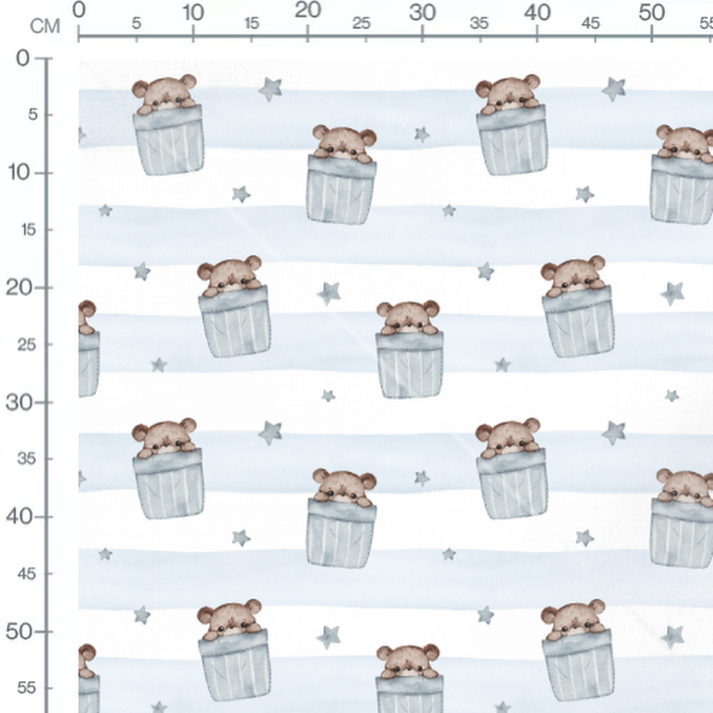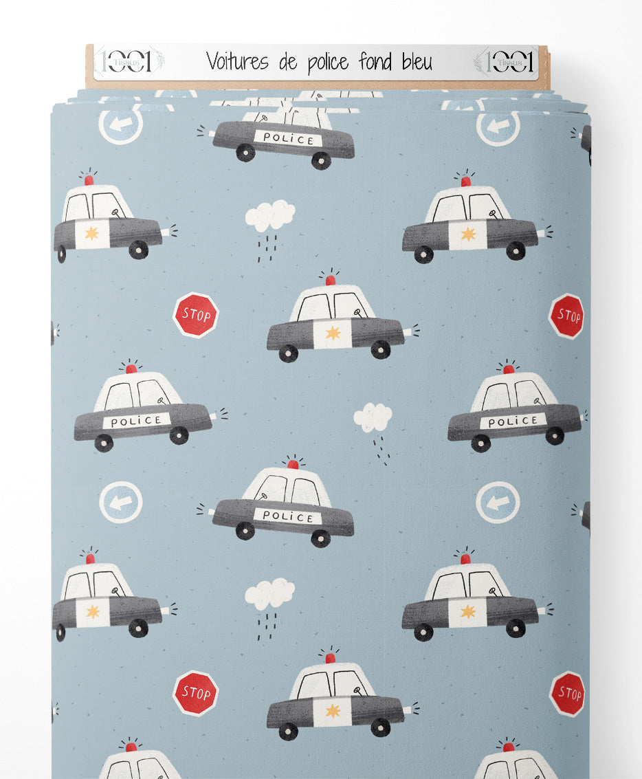 Les voitures de police sont illustrées avec des gyrophares rouges. Des nuages blancs avec quelques gouttes de pluie ajoutent un détail météorologique. Des panneaux stop rouges apportent une touche de couleur vive.Les tissus