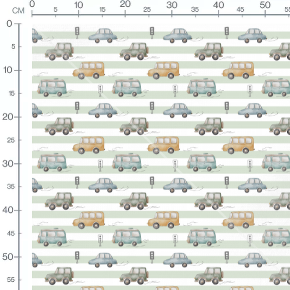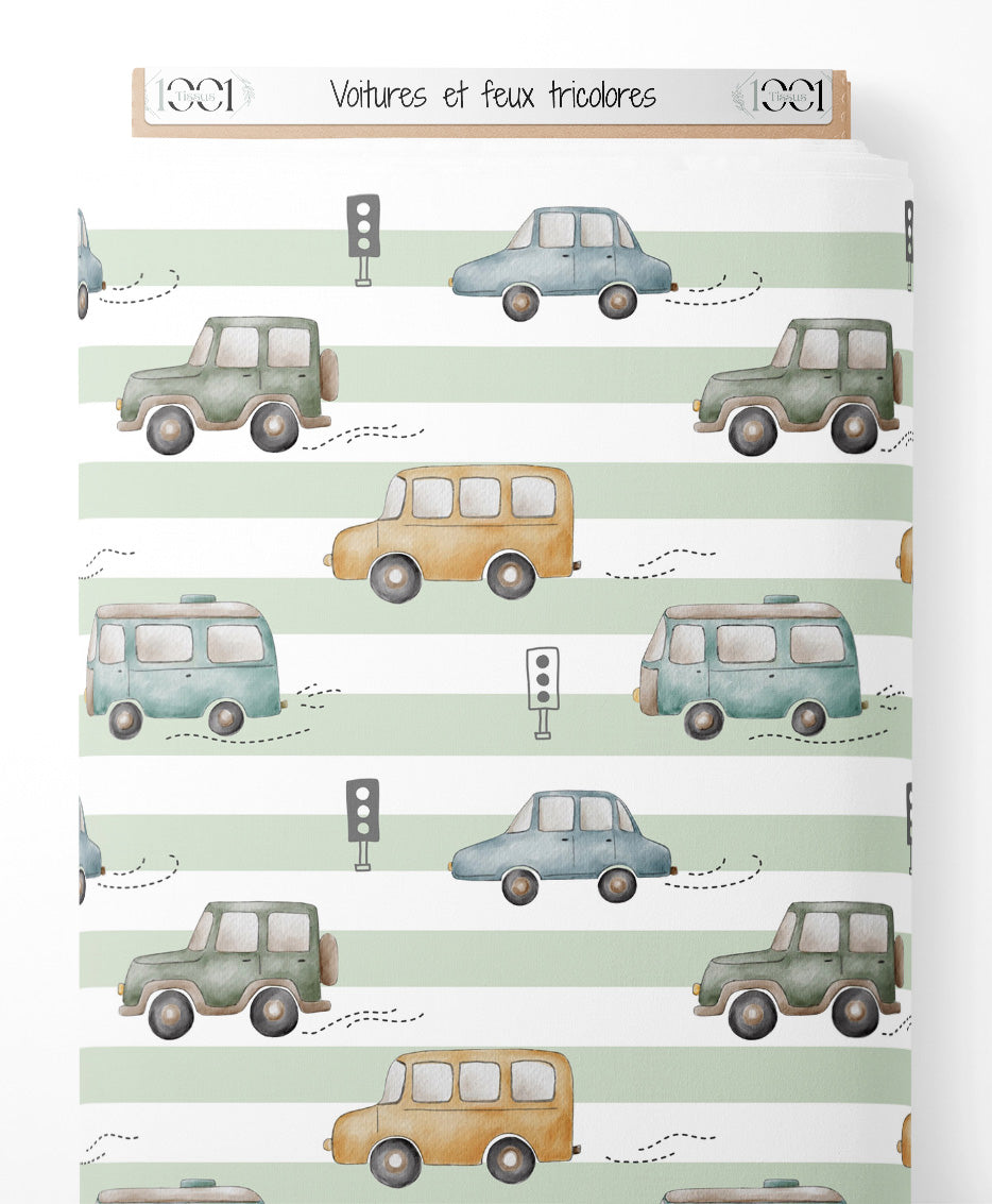 Les voitures sont de différentes couleurs comme bleu, vert et orange. Les feux tricolores sont noirs et ajoutent un élément urbain au motif. Le fond rayé alterne entre des bandes vertes et blanches.Les tissus
