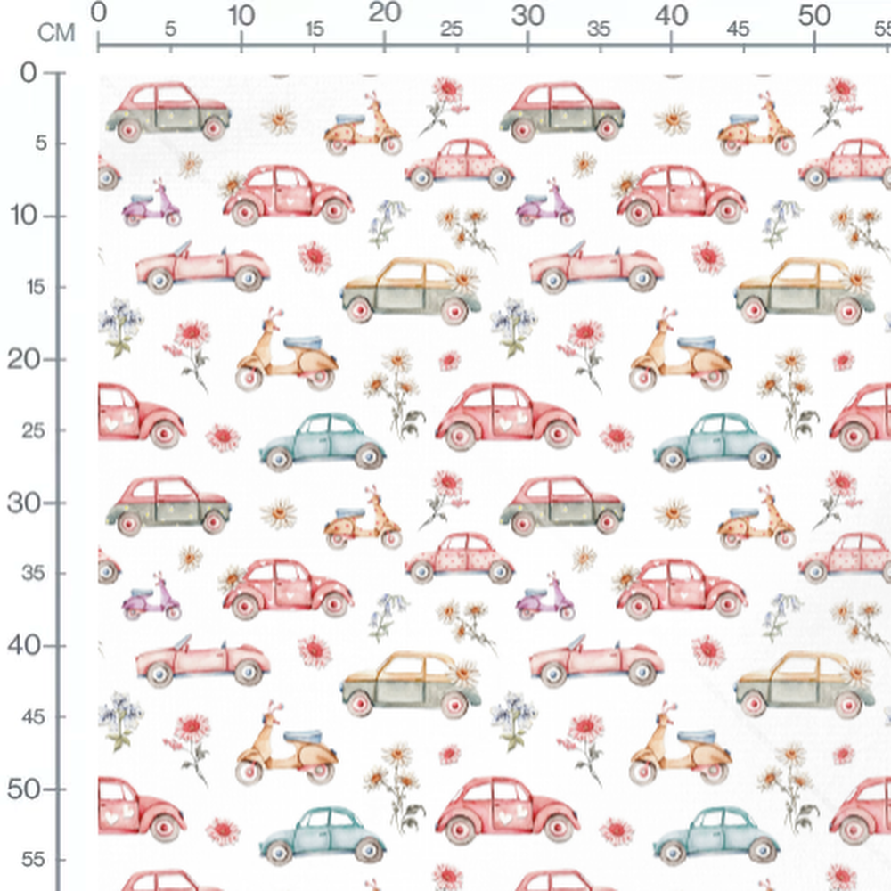 Les voitures sont de différentes couleurs pastel, incluant le rouge, le vert et le bleu. Les scooters ajoutent une touche ludique avec des teintes vives. Des fleurs roses et blanches sont dispersées entre les véhicules, apportant une touche florale.Les tissus