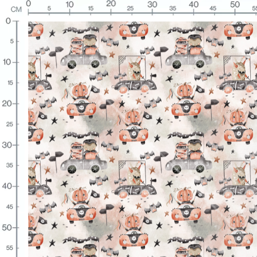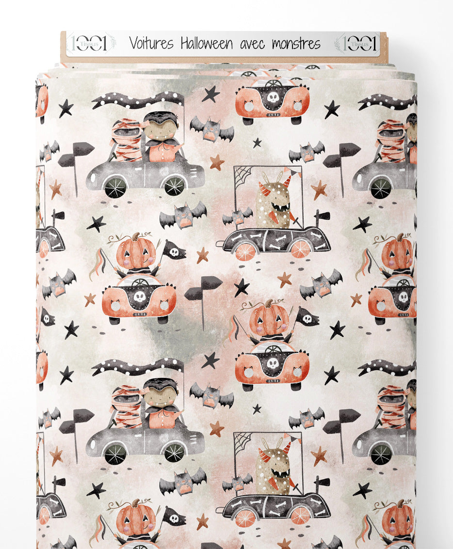 Les voitures contiennent des personnages déguisés en momies et vampires. Des citrouilles décorées sont posées sur les voitures. Des chauves-souris volent autour des voitures. Des étoiles et des panneaux complètent le motif.Les tissus