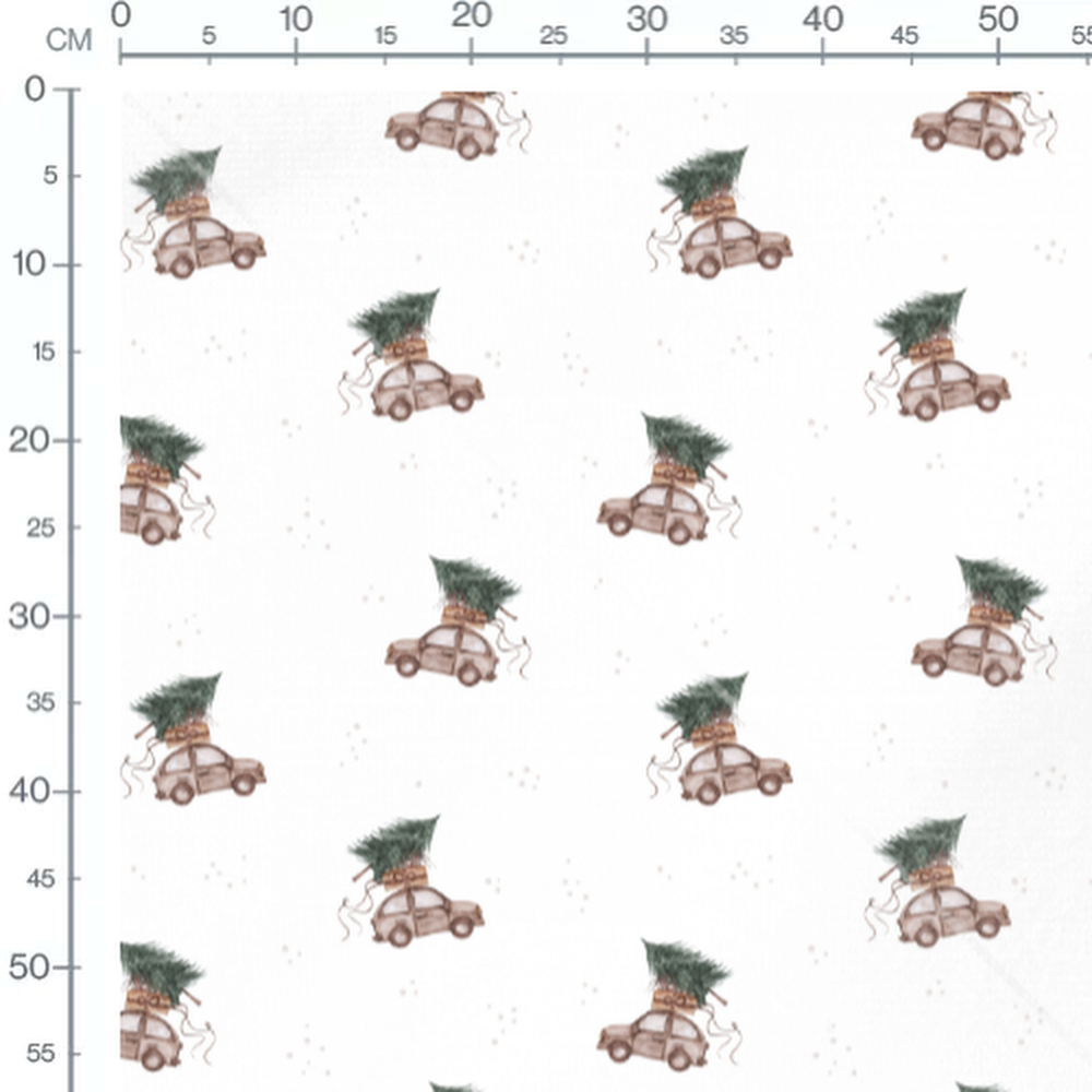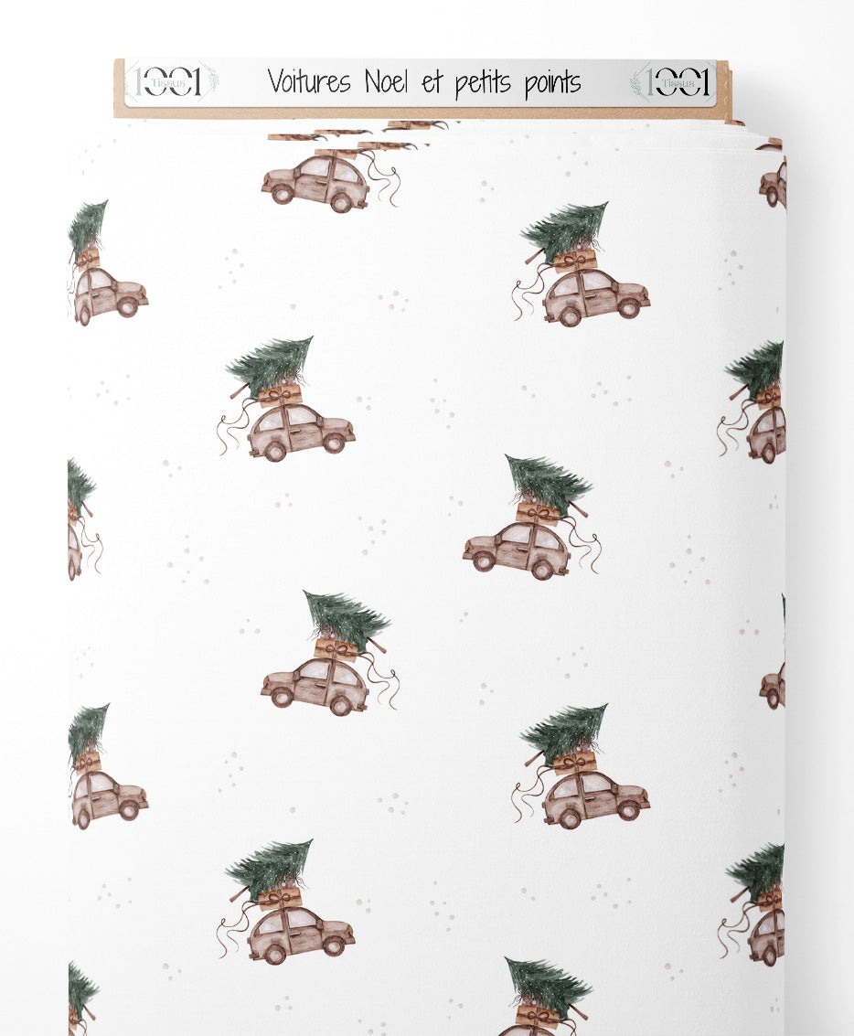 Les voitures sont décorées de rubans et de sapins de Noël. Les sapins sont ornés de cadeaux rouges et verts. Le fond blanc est parsemé de petits points gris clairs.Les tissus