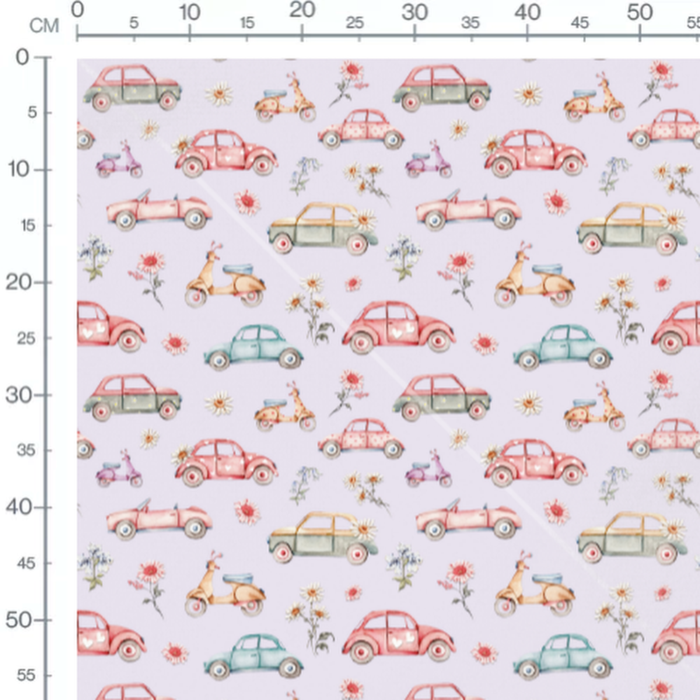 Les voitures sont de couleurs pastel variées comme le rouge, le vert et le bleu. Les scooters ajoutent une touche ludique avec leurs teintes douces. Les fleurs incluent des marguerites et d'autres petites fleurs colorées.Les tissus
