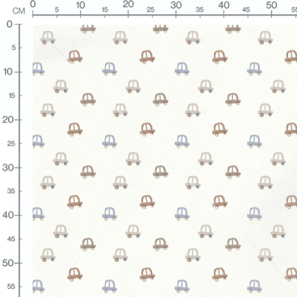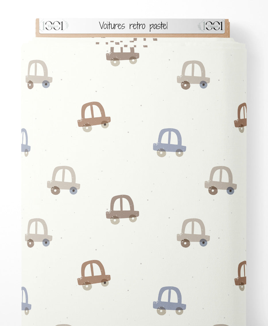 Les voitures sont dessinées dans un style simple et épuré. Les teintes pastel ajoutent une touche douce et apaisante. Le fond blanc met en valeur les motifs de voitures. Les petits points gris ajoutent une texture subtile.Les tissus