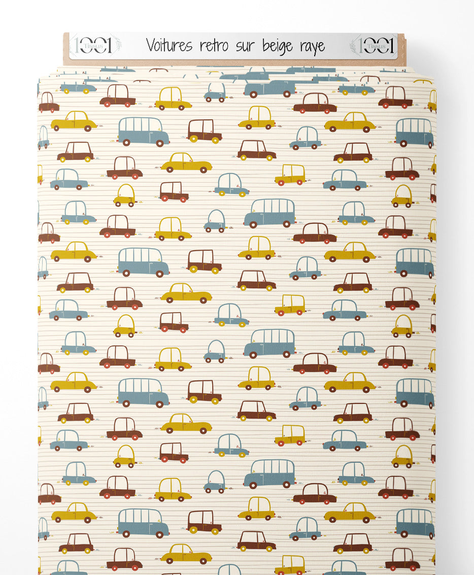 Les voitures sont de style rétro avec des formes arrondies. Les rayures du fond ajoutent une texture subtile. Les couleurs des voitures varient entre le rouge, le jaune et le bleu, créant un motif ludique.Les tissus