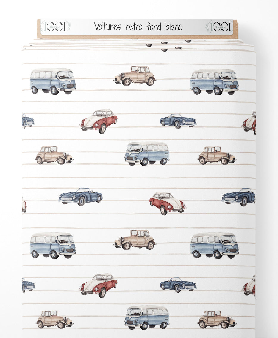 Tissu - Voitures rétro sur fond blanc