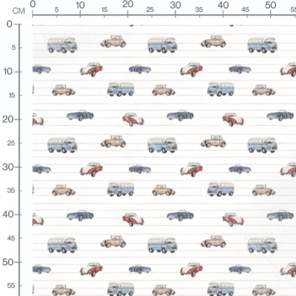 Les voitures sont dessinées dans un style aquarelle avec des détails subtils. Les lignes horizontales ajoutent une touche graphique discrète. Les véhicules incluent des modèles de voitures et de vans classiques.Les tissus