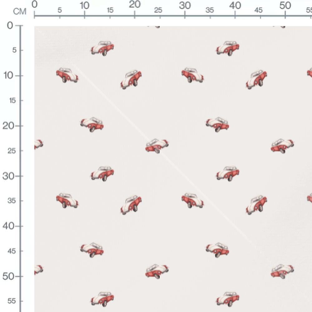 Les voitures ont un design vintage avec des détails réalistes. Le fond blanc met en valeur les couleurs rouges et blanches des voitures.Les tissus