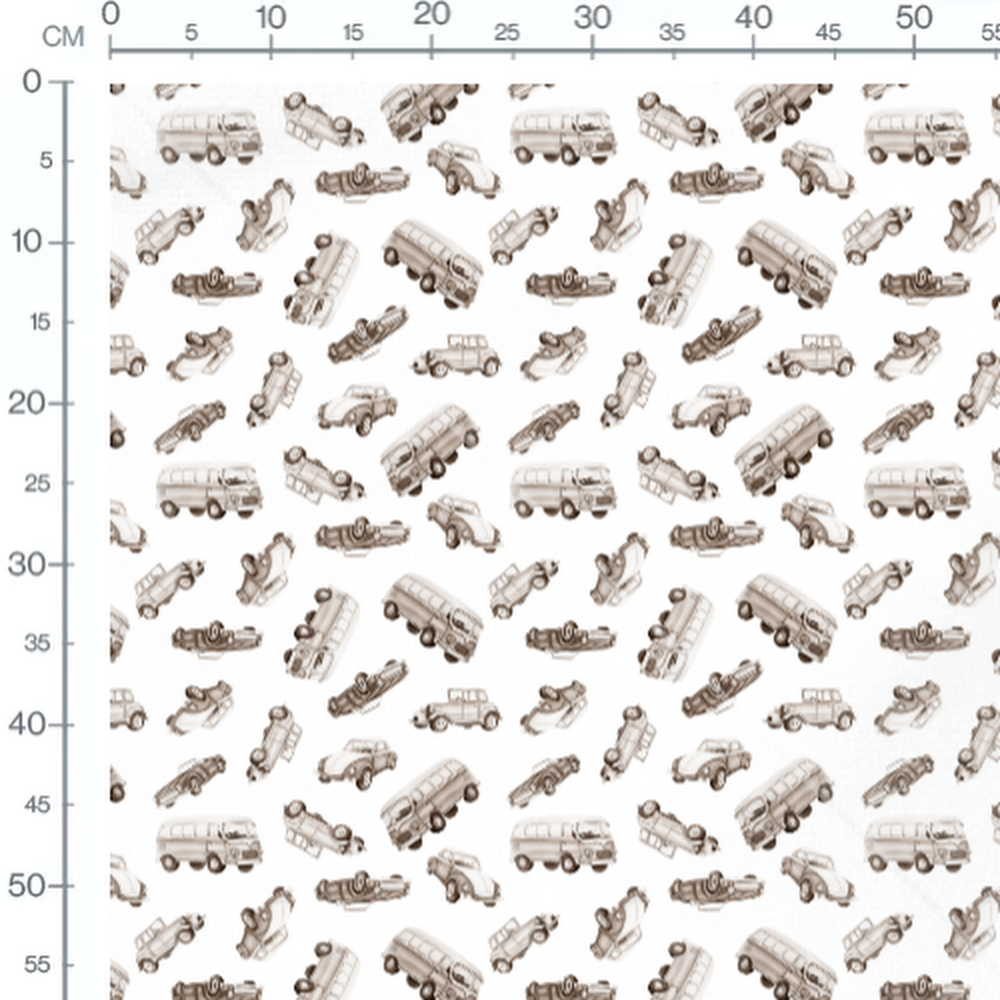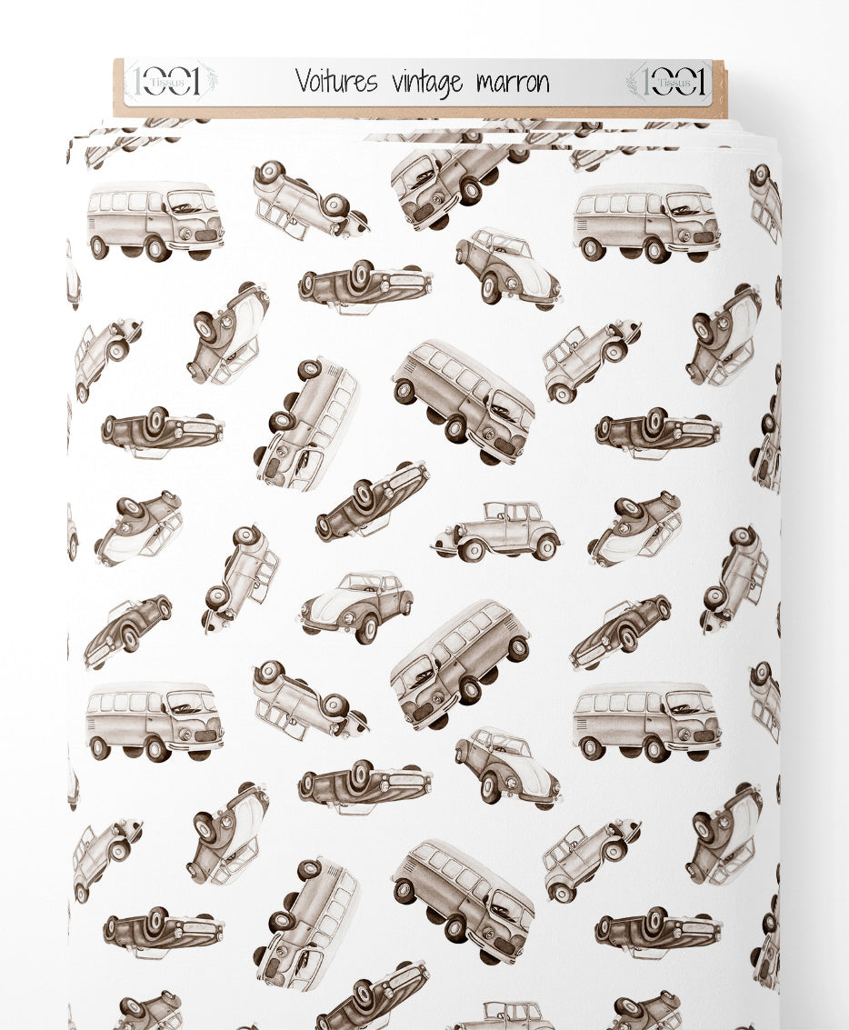 Les voitures incluent des modèles classiques et des vans rétro. Les illustrations sont détaillées avec des nuances de marron. Le fond blanc met en valeur les dessins des véhicules.Les tissus