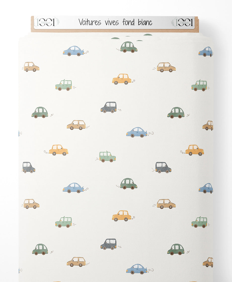 Les voitures sont dessinées de manière simple et enfantine. Chaque voiture a une couleur distincte et des roues marron. Le fond blanc met en valeur les couleurs douces des voitures.Les tissus
