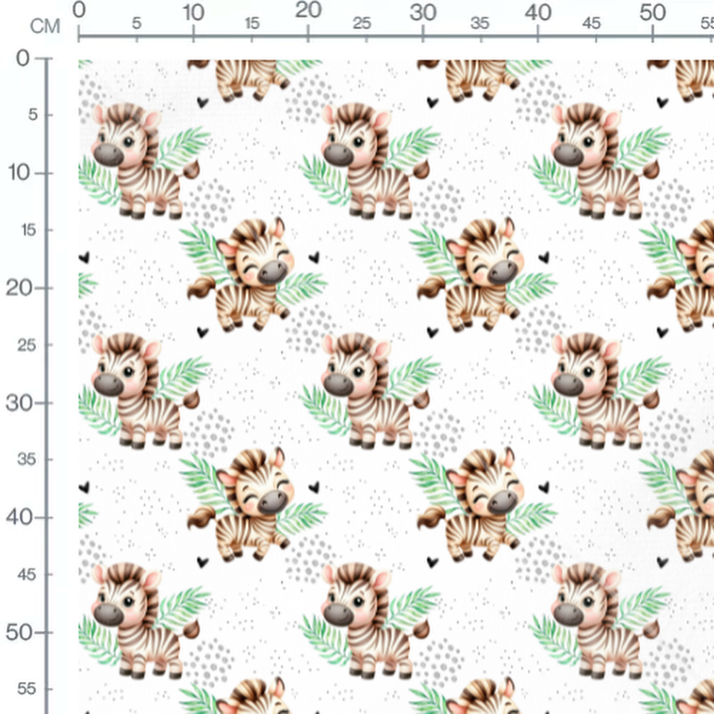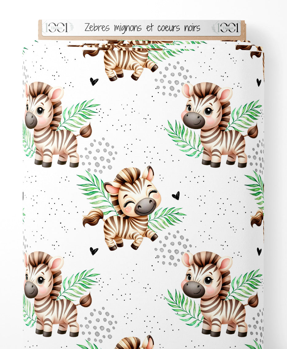 Les zèbres ont des expressions adorables et des rayures distinctes. Des motifs de feuilles vertes ajoutent une touche naturelle. De petits cœurs noirs et des points gris complètent le design.Les tissus